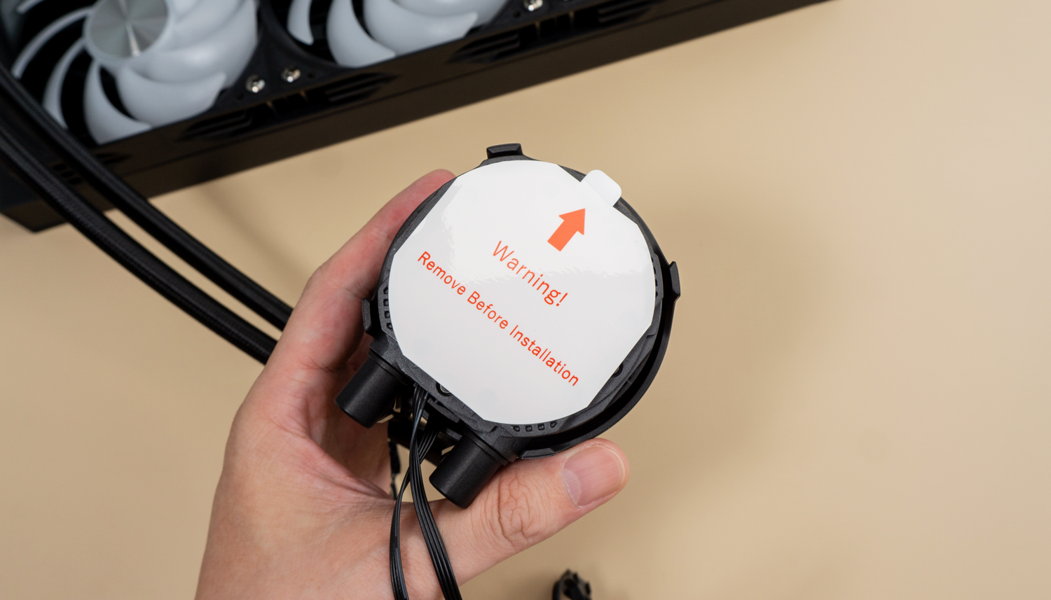 水泵方案采用三相电机搭配陶瓷轴承轴芯,转速800-3000RPM(±10%)范围,冷头的接触面采用紫铜底。不过需要提醒的是,安装时除了要记得撕掉标签以外,还要为CPU涂上硅脂才能获得最佳散热效果。
