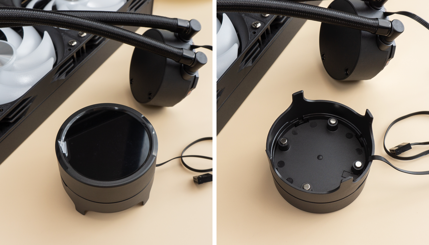 虽然水冷头是显示屏配置,但实际上是通过磁吸结构来固定,让屏幕可以随意调整角度。换句话说,我们在安装水冷时根本无需考虑安装角度,后续可以通过调整顶盖来保持显示始终竖向。