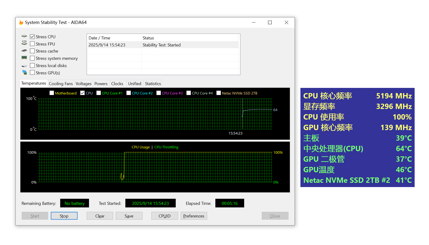 那么水冷的散热能力如何呢?在室温32°C的全封闭华硕机箱环境下,初始待机时CPU温度为41.6°C,散热系统轻松应对低负载场景。当进行Stress CPU测试时,CPU温度稳定在64°C,核心硬件的热量控制相当扎实。