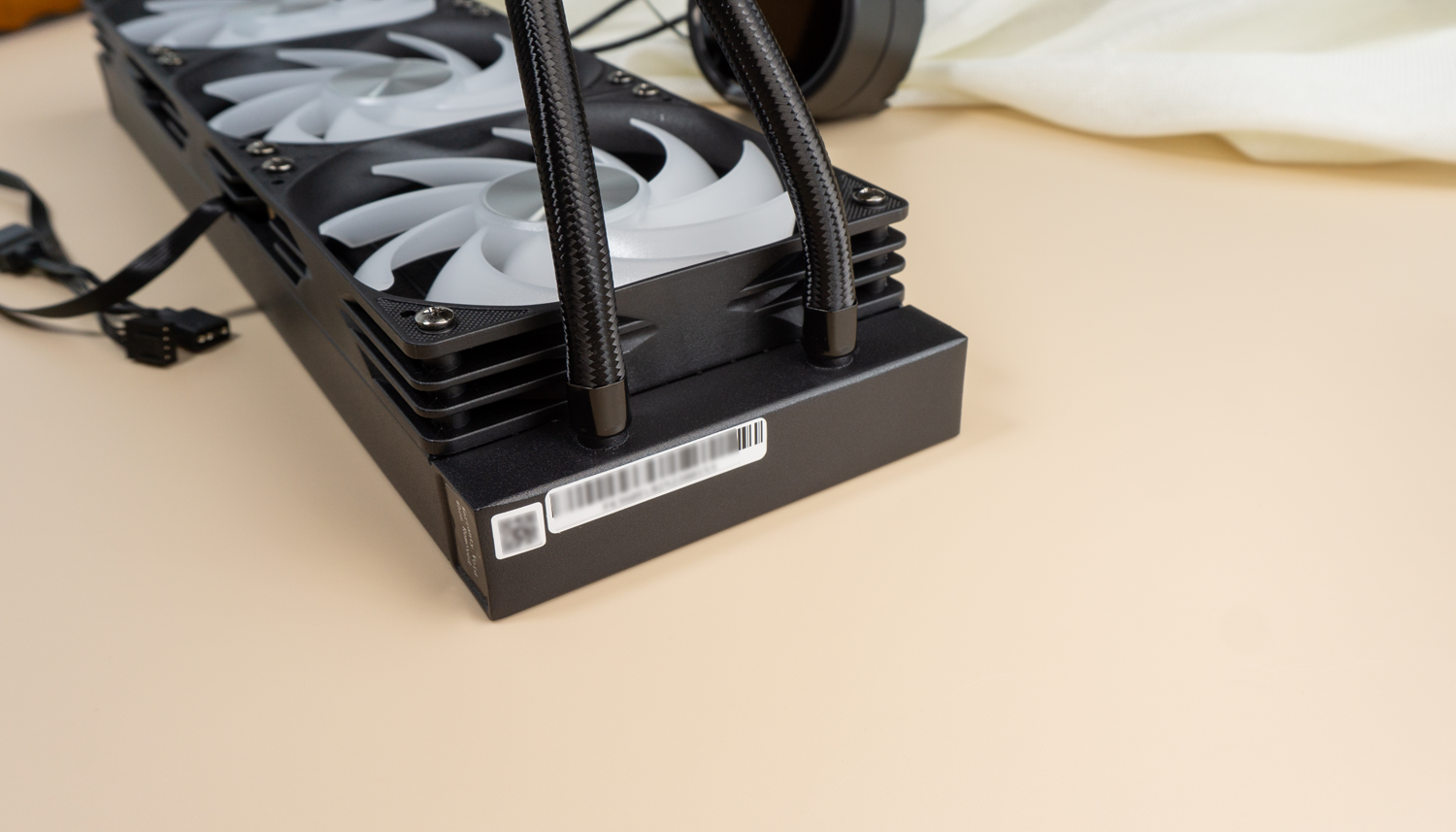 冷排导液管表面包裹蛇皮编织网,耐磨性不错。此外,水冷管接头具有较大的转向范围,配合430mm长度的水管,确保了在各种机箱布局中的安装兼容性,无论ATX还是MATX的机箱均能适配。
