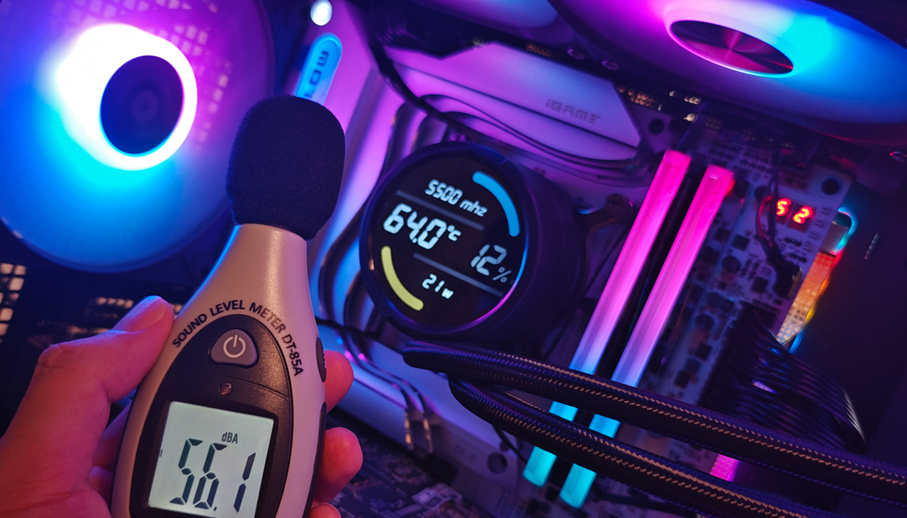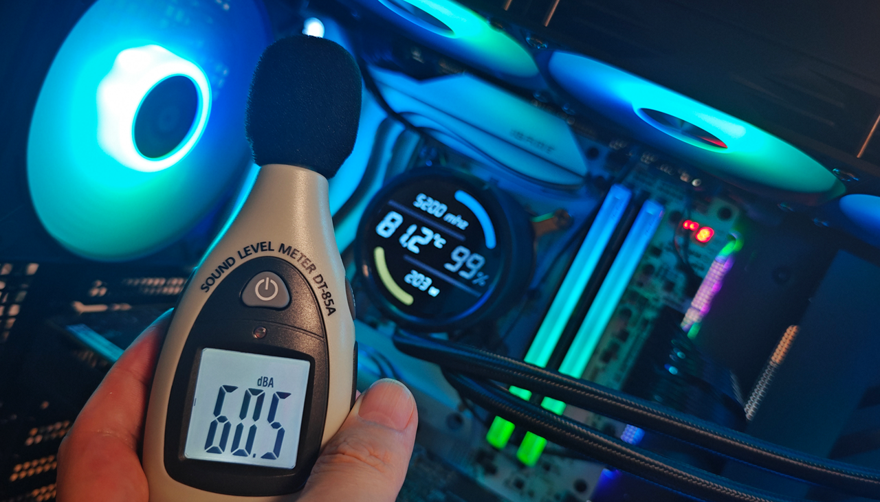 整机满负荷运行时,整体的风扇噪音值为60.5dBA,而在游戏过程中,噪音会降至约56dBA,不会对使用体验造成干扰。