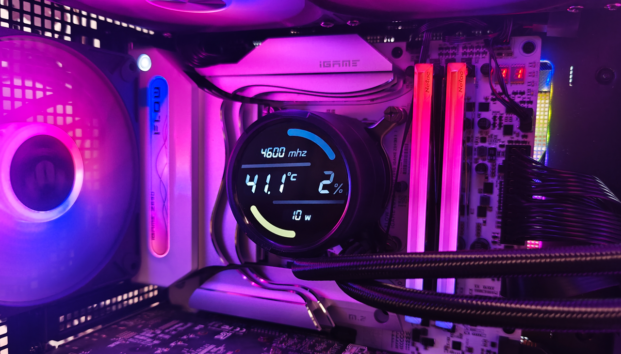 上机效果展示这款2.6英寸屏幕可实时显示CPU核心频率、温度、线程占用率及TDP功耗等关键硬件参数,让性能状态一目了然。设计上巧妙融入初云黄与天空蓝双色装饰条,构建出极具辨识度的极客美学。