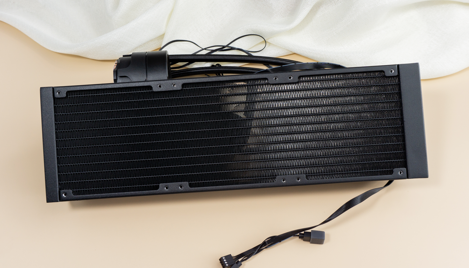 冷排尺寸为394×120×27mm,材质为全铝,散热鳍片为单波结构,12条水道设计,整体做工精细,间隔密度处于行业主流水平,完全超出了这个价位段产品的预期水准。配合高密度低水阻工艺,整体解热能力达300W。