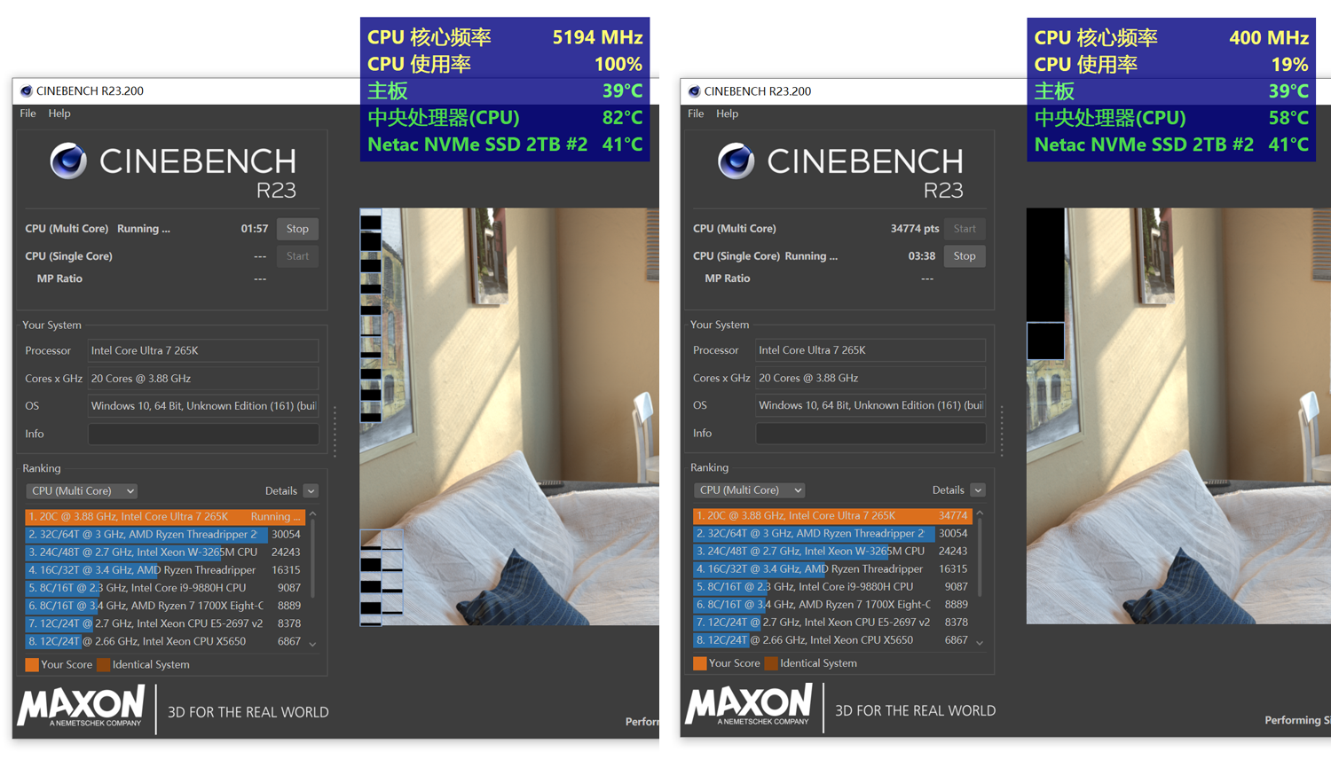 在Cinebench R23测试中,多核运行时CPU温度为82°C左右,单核则稳定在58°C,整体表现符合酷睿Ultra 7 265K处理器的常规温控水准。