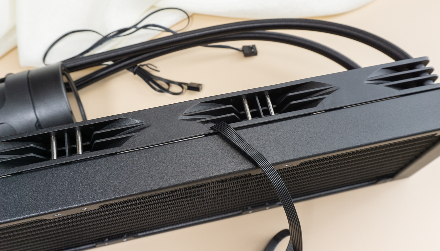不过风扇的线缆引出位置并不在两端,而是放到了居中处。相比传统的两端引出方式,这种布局更适合追求简洁美观的开放式机箱方案,走线效果更加整洁。当然,如果是对冷排安装位置不固定的情况(如前置、顶置或侧置冷排),那么传统的两端引出设计可能更具灵活性。