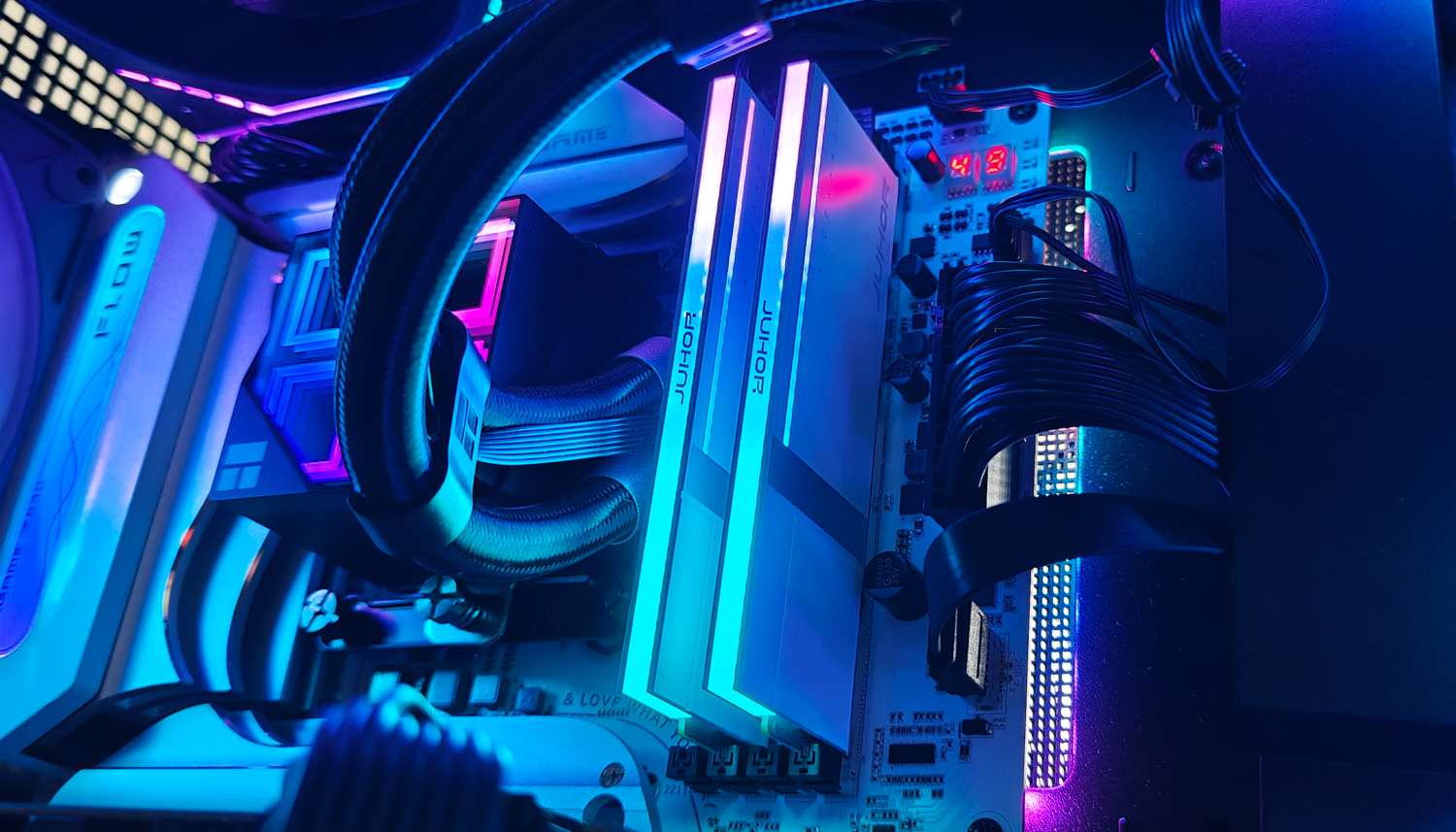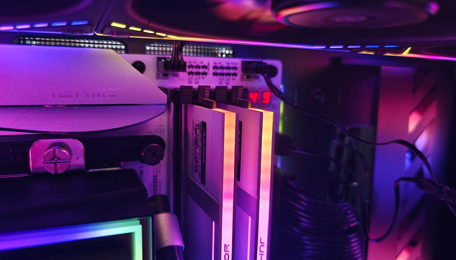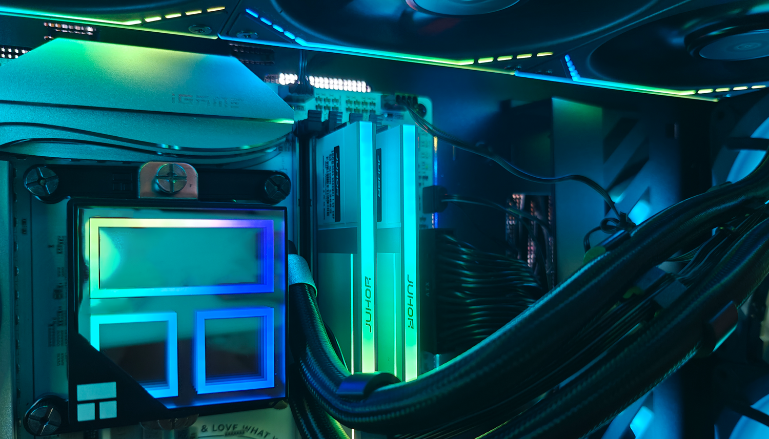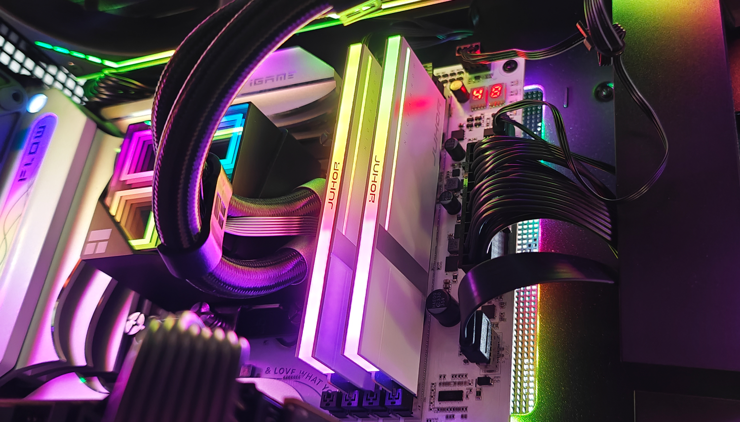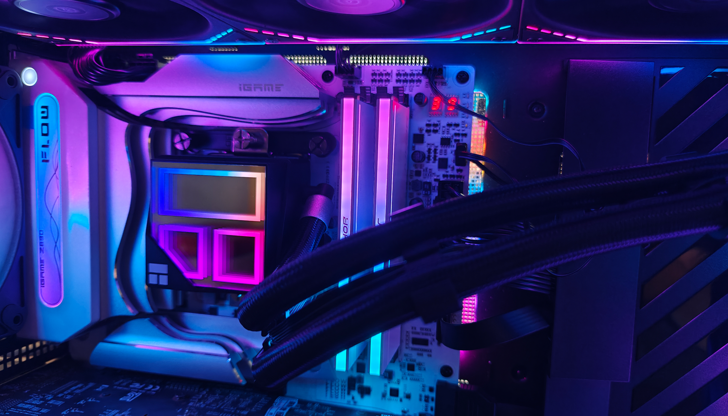 我的上机测试本次测试使用Intel Ultra 265K处理器,搭配七彩虹Z890平台。玖合异刃DDR5 8000 RGB灯条上机后,不仅顶部的RGB导光条会自动点亮,包括侧面的透明处也会发光,整体会以颜色过渡方式变化。