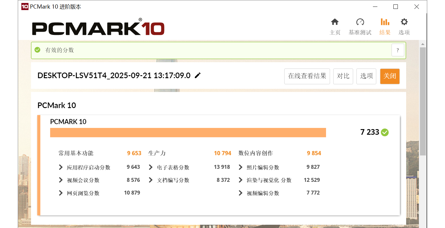 PCMark 10的场景评估中,主机整体总分为7233分,其中生产力得分最高,达到了10794分。