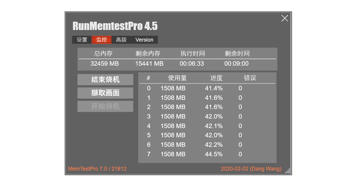 使用RunMemtest Pro烧机,玖合异刃DDR5 8000 RGB灯条通过所有测试,这表明它能够在8200MHz频率下稳定运行。其实在跑至20%时,没有跳错就基本不会有问题,一般不稳定都会在15%进度前。