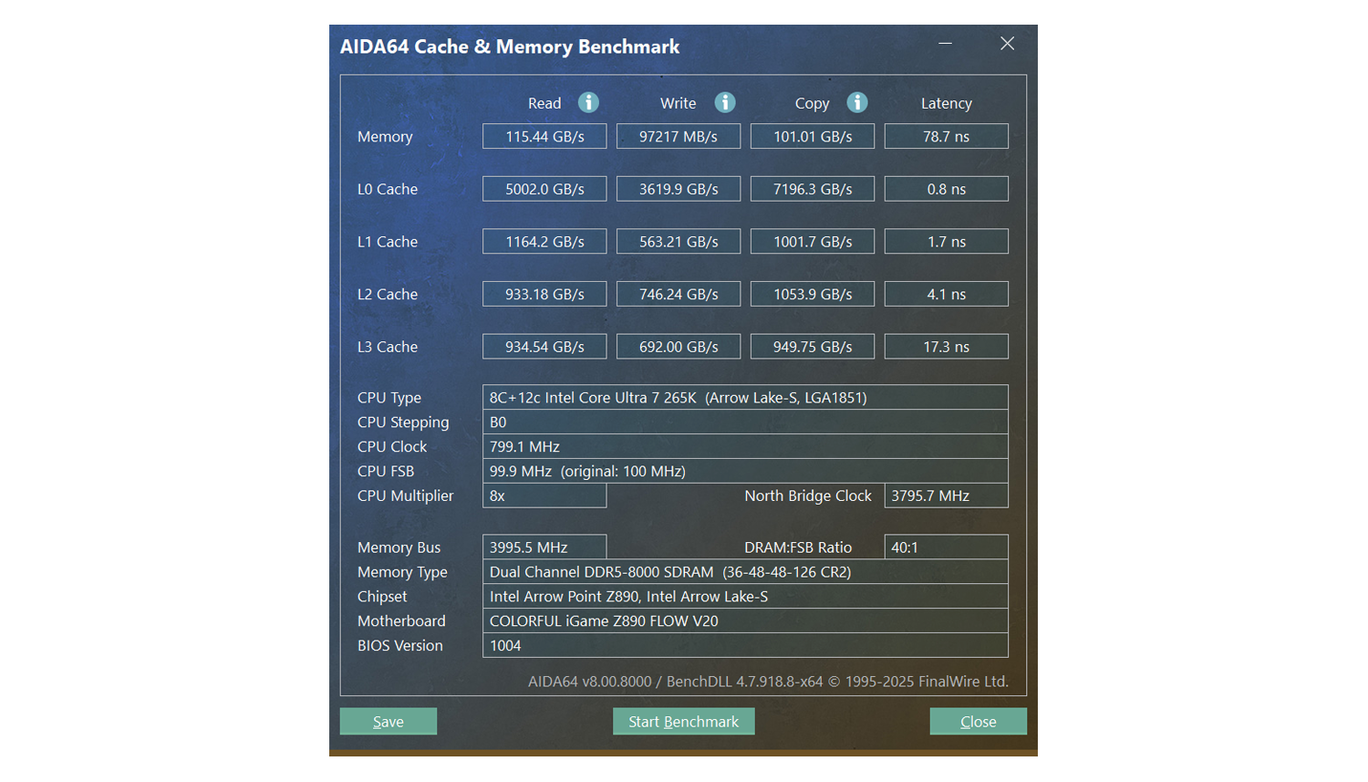 调用AIDA64测试,玖合异刃DDR5 8000 RGB灯条的读取速度飙升至115.44 GB/s,较默认状态提升34.4%;写入与复制速度分别达到97217 MB/s和101.01 GB/s,增幅达25.3%和30.3%;延迟更是显著优化至78.7ns,响应速度提升23.6%。