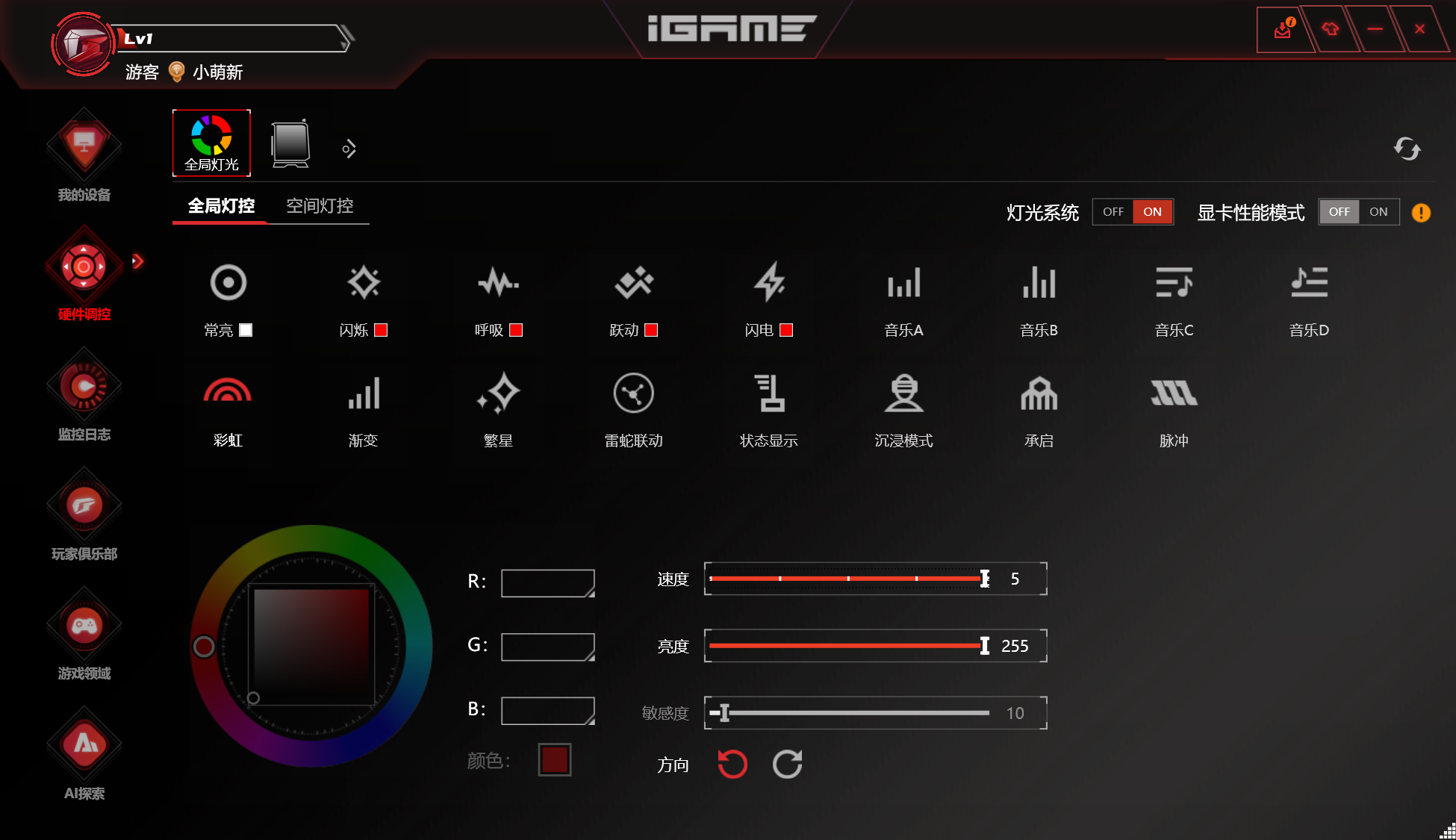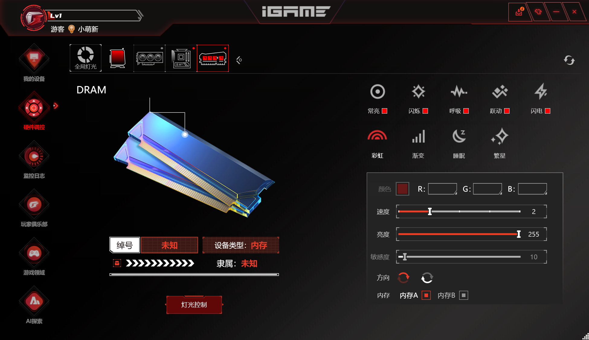 打开iGame软件后,在硬件调控选项中会多出内存同步选项,然后即可选择灯效样式,调整色彩速度、亮度、颜色、方向等等,可玩性比较多。如果想要低调的全黑环境,那么也可以选择“OFF灯光系统”,让一切回到平静中。