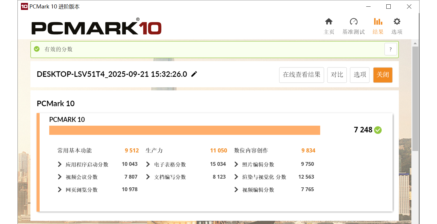 回到PCMark 10场景评估,主机整体总分同样略有提升,其中生产力得分也获得了更高的11050分值。