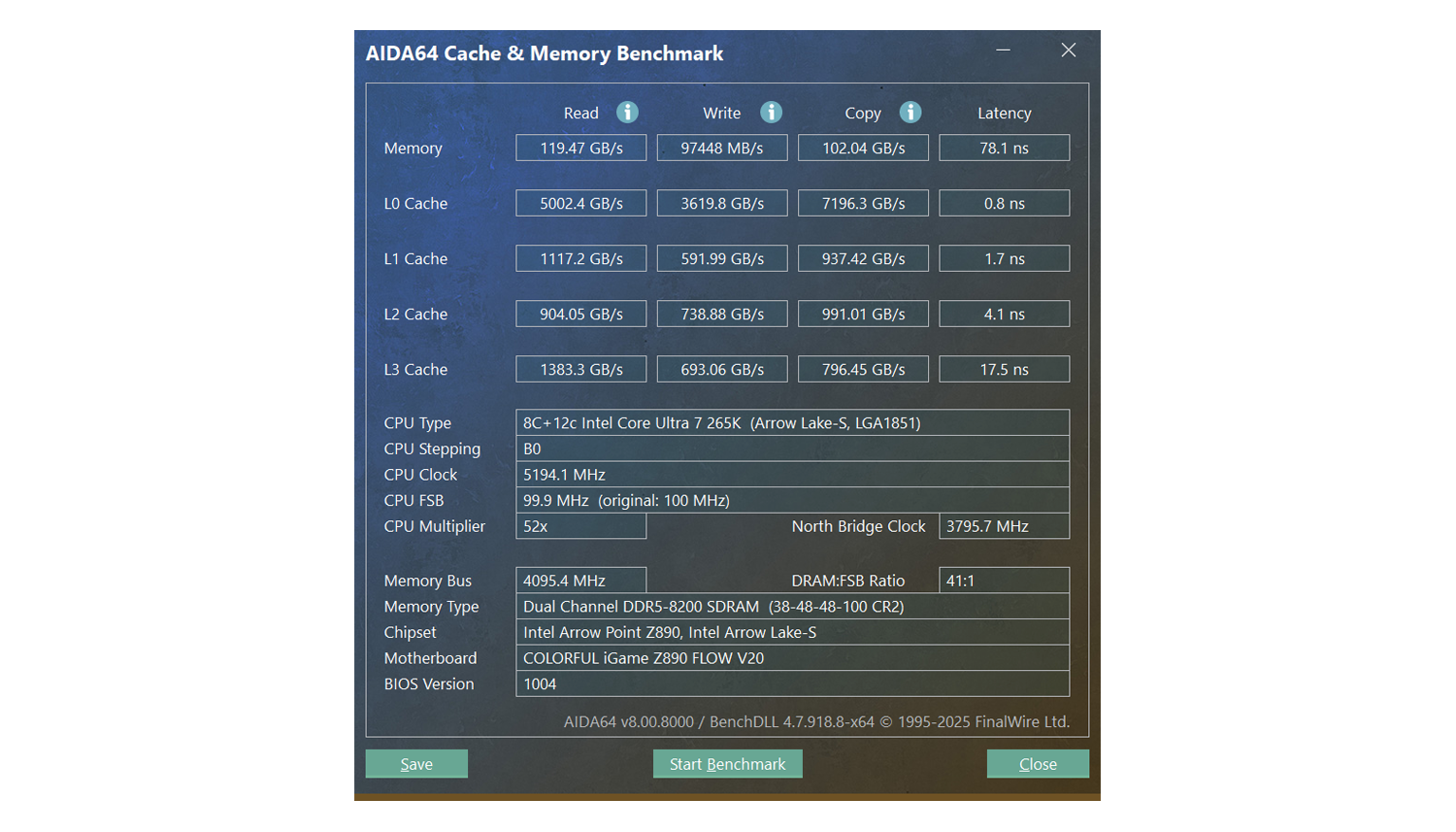 此时打开AIDA64测试,相较之前的8000MHz状态,读取速度达到了119.47 GB/s,写入97448 MB/s,复制速度102.04 GB/s,延迟值78.1 ns,可见即便是小幅频率提升也能带来可观的边际效益。
