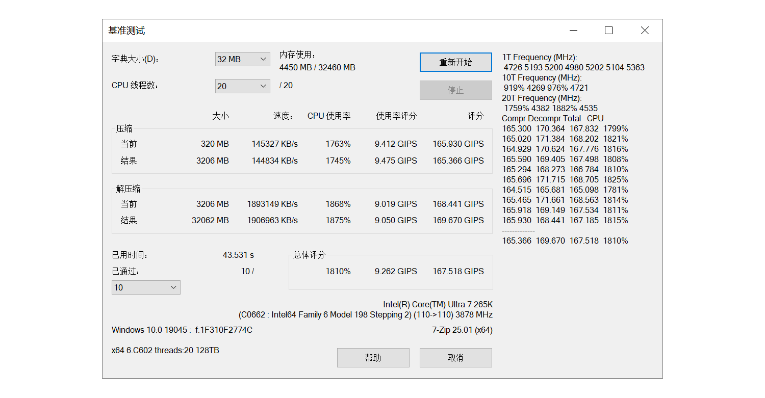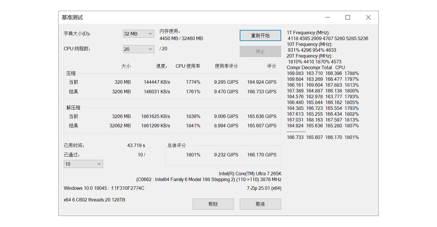 同样打开7-Zip进行测试,整体测试为167.518GIPS,解压缩测试分169.670GIPS(较前状态提升2.5%)。
