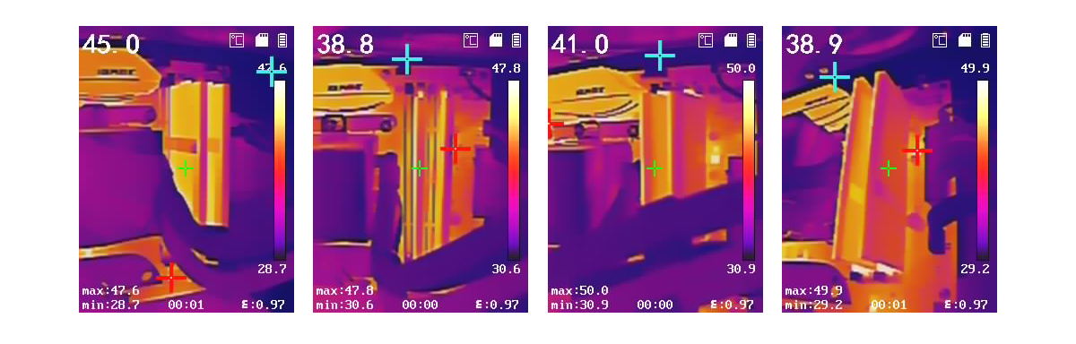 在压力测试过程中,使用红外线温度仪检测内存情况,玖合异刃DDR5 8000 RGB灯条的散热马甲外壳温度为45℃左右,不必太担心散热情况。