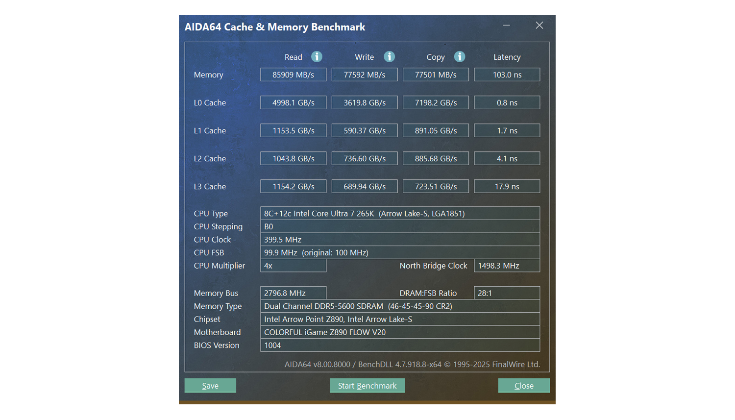 通过AIDA64测试,在默认频率5600MHz下玖合异刃DDR5 8000 RGB灯条的读取速度为85909 MB/s,写入77592 MB/s,复制速度77501 MB/s,延迟值103 ns。