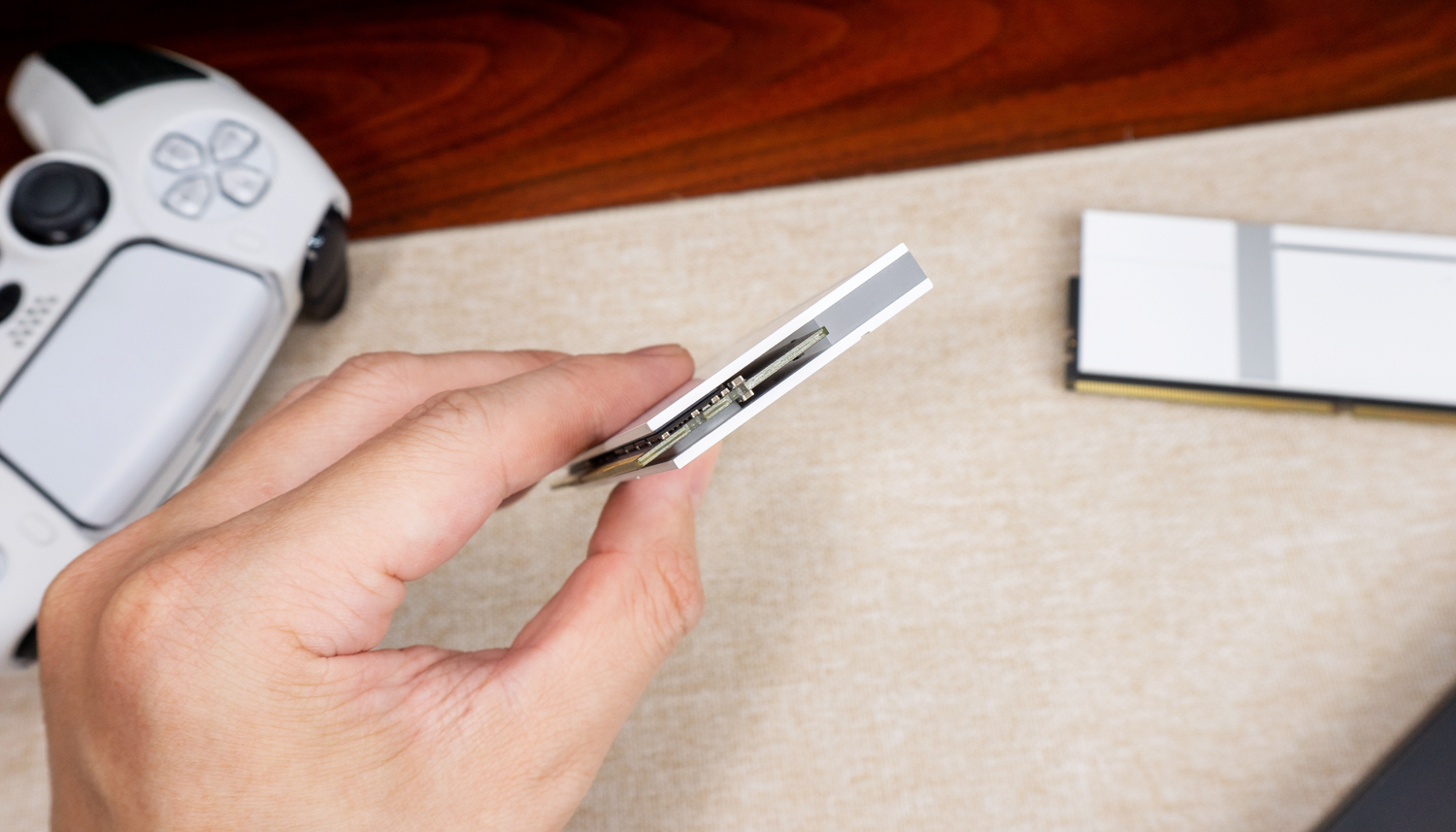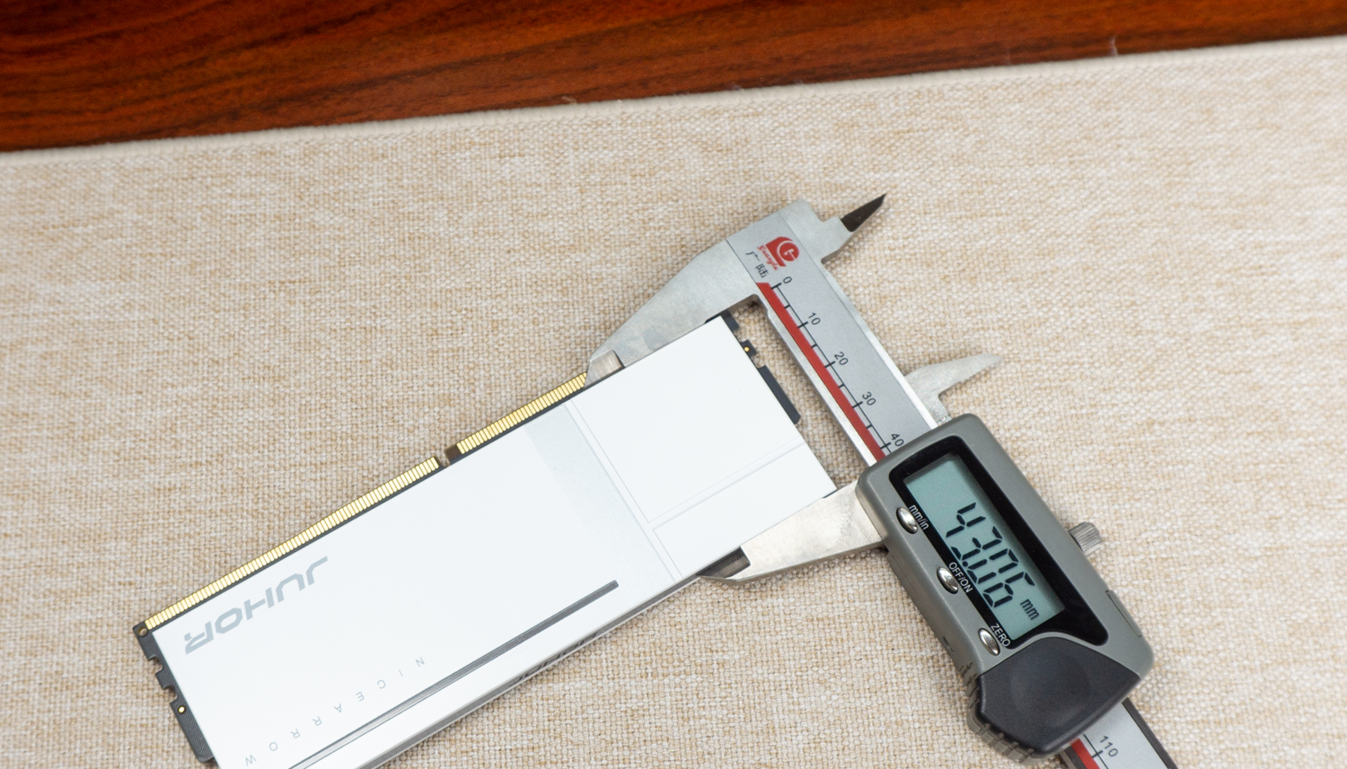 从侧面可以看到,马甲+导热贴+内存颗粒这三者间的贴合十分紧密,可以说已经是逼近高端内存的做工。实际上内部的PMIC芯片也有专属散热覆盖,配合ON-Die ECC纠错,为高频超频提供了可靠的稳定性保障。