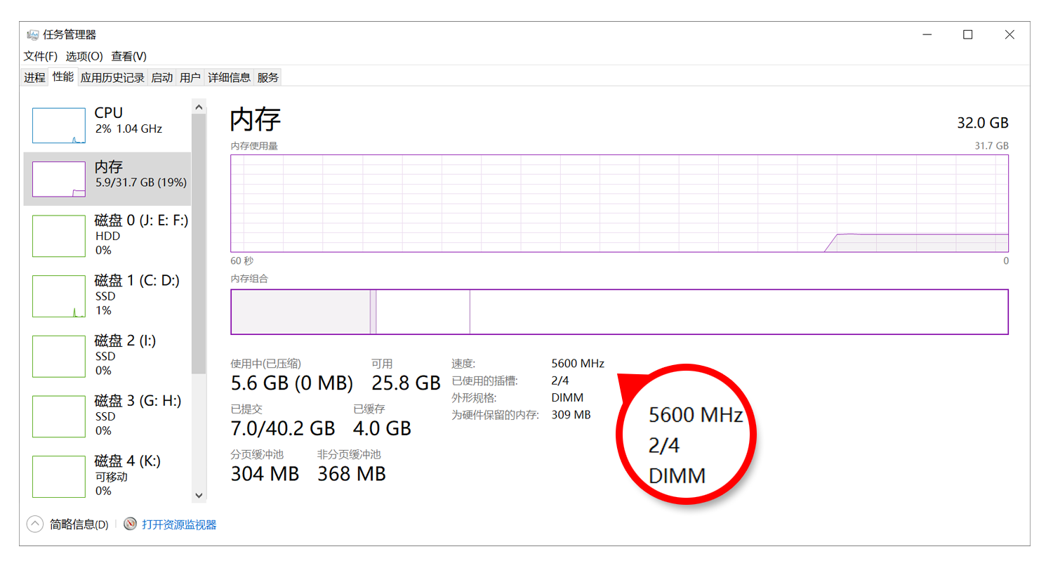 回到系统界面下,通过任务管理器可以查看到当前的内存速度为5600MHz频率,双通道配置下32GB总容量充分满足多任务需求。