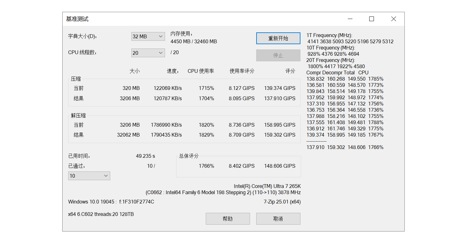 使用7-Zip自带的Benchmark进行测试,压缩测试得分为137.910GIPS,解压缩测试分159.302GIPS,整体测试总评分148.606GIPS。