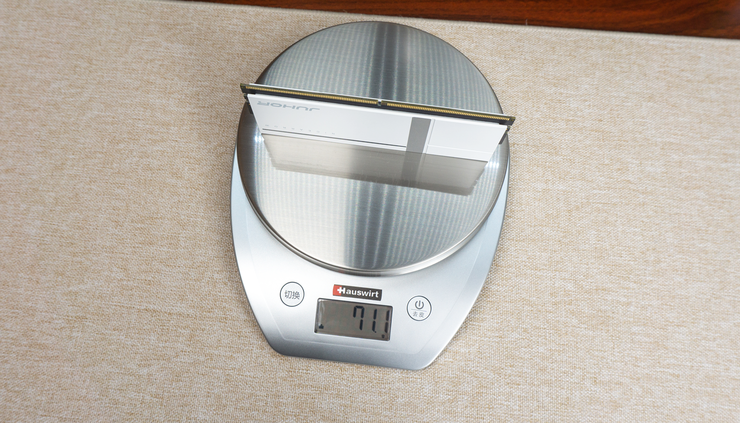 我入手的是白色款的玖合异刃DDR5 8000 RGB灯条,但散热马甲的底子依旧是铝合金材质。实测厚度约为1.5mm,上手也颇具分量感,单条重量在71g左右。