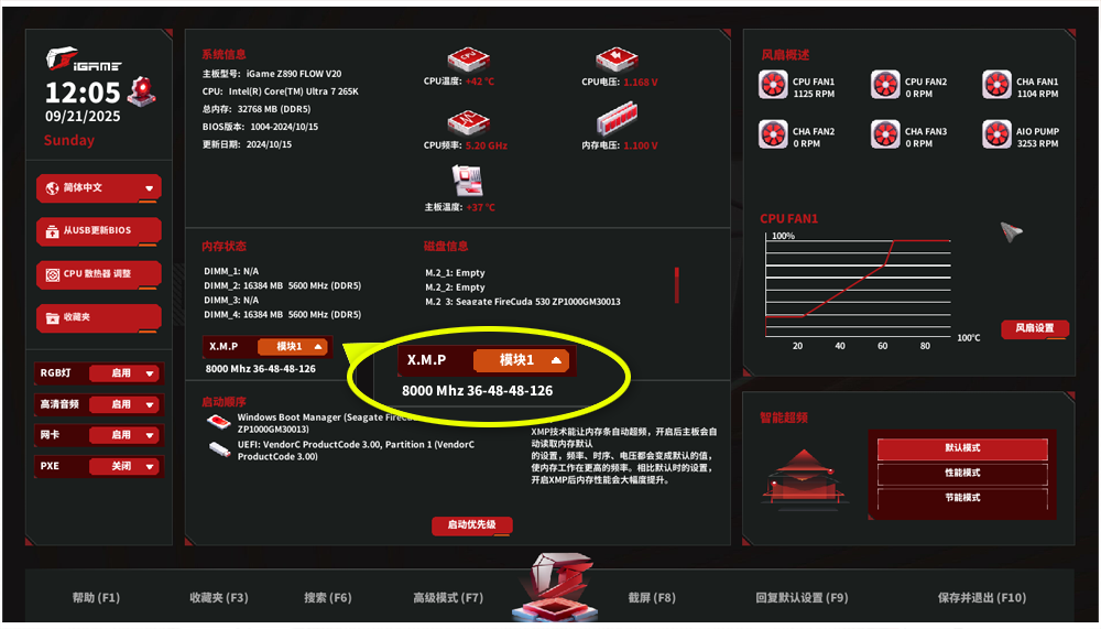 随后重启主机,在主板BIOS里启用XMP内存超频功能。进入系统后,玖合异刃DDR5 8000 RGB灯条的运行规格已达到8000MHz频率,这套内存即刻蜕变为完全体状态。