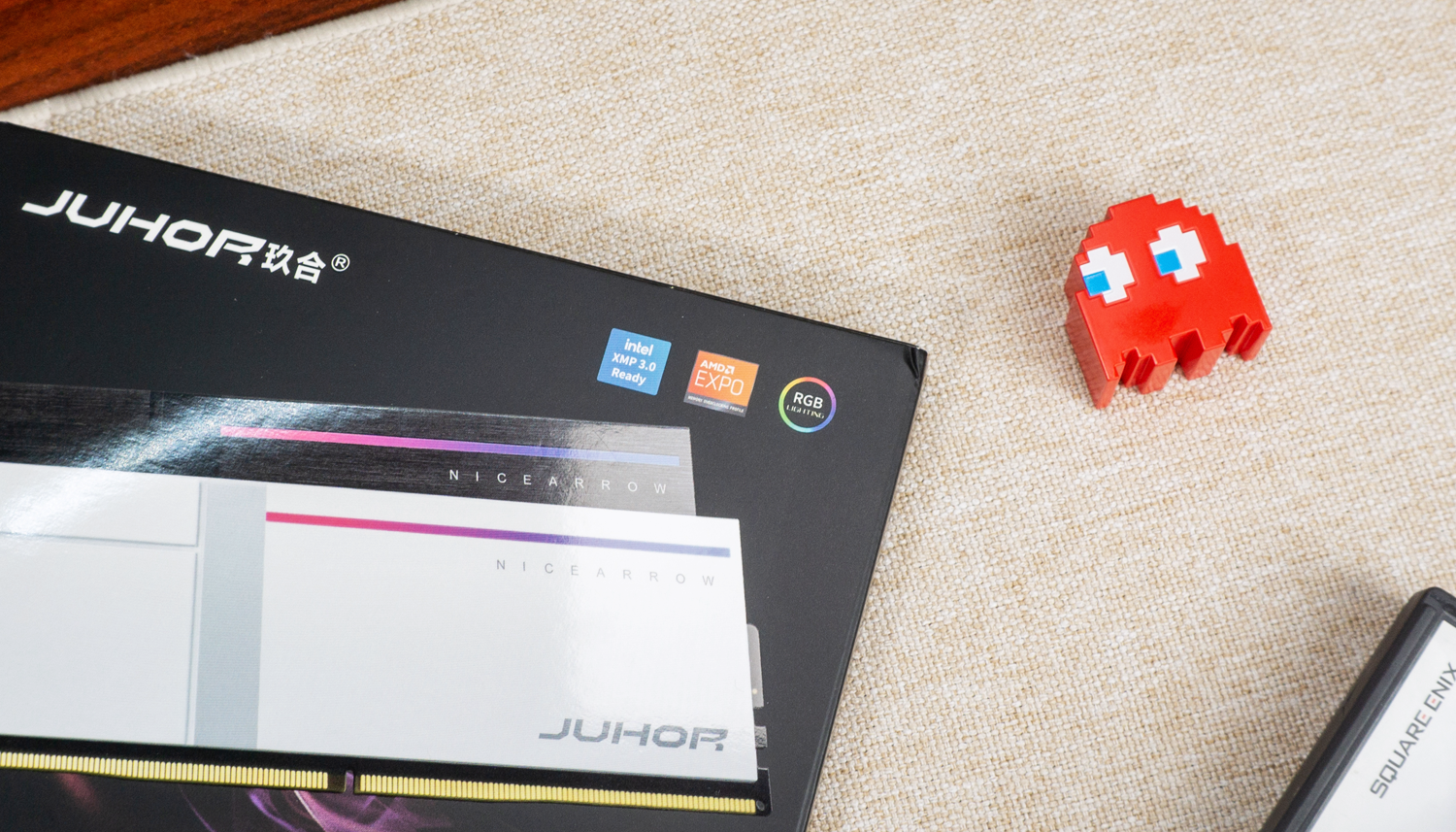 盒体右上角的三枚彩色标识,清晰传递出产品所包含的主要特性:支持Intel XMP3.0、AMD EXPO双平台一键超频,以及RGB神光同步协议。