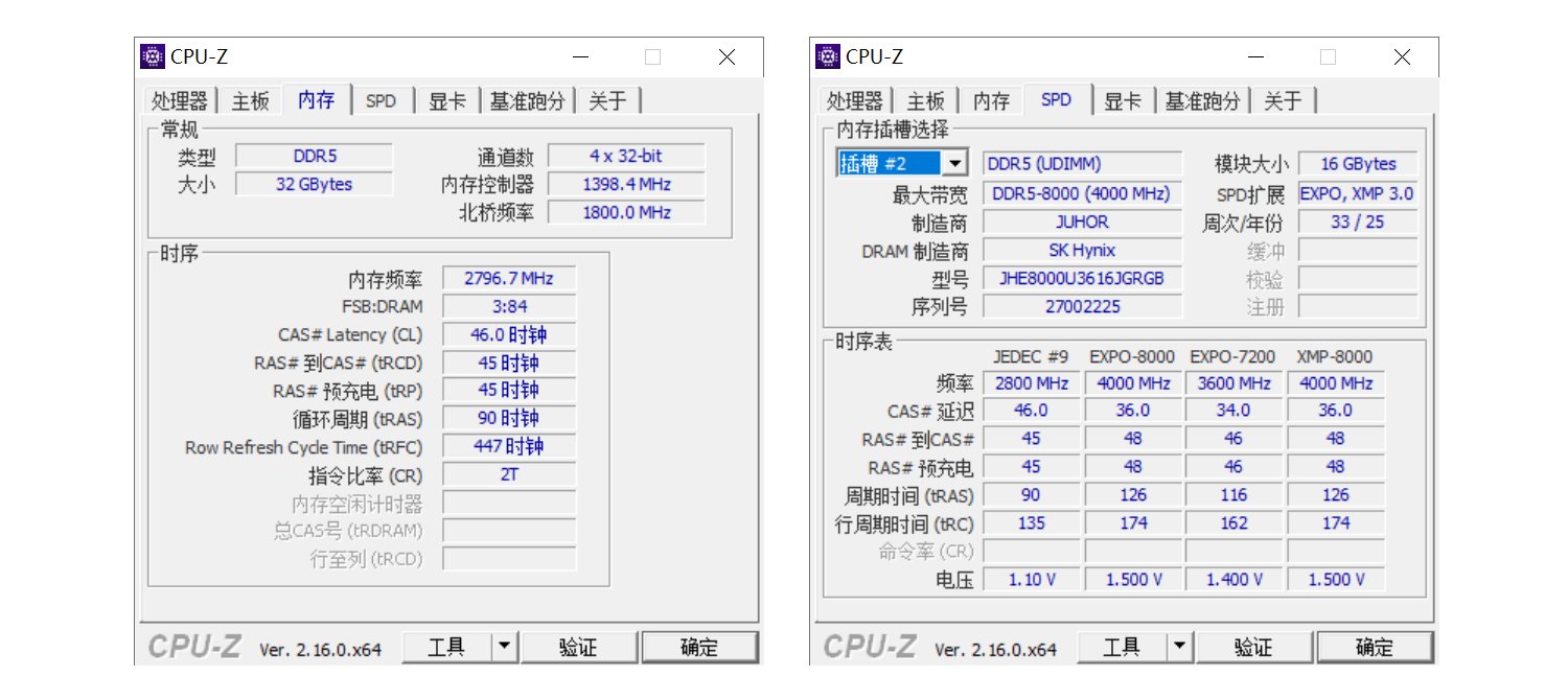 在CPU-Z中确认,玖合异刃DDR5 8000 RGB灯条的标称最大带宽8000MHz(等效4000MHz),DRAM制造商SK hynix(海力士),支持EXPO和XMP 3.0双超频协议,预设XMP/EXPO模式时序为CL36-48-48-126,工作电压1.5V,这与标签上的信息完全吻合,为后续性能释放埋下伏笔。