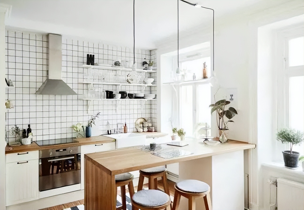 若家里空间实在有限,摆不下常规餐桌椅,可在厨房设计小吧台 —— 占地面积小,搭配两张高脚凳,日常能当餐桌用;