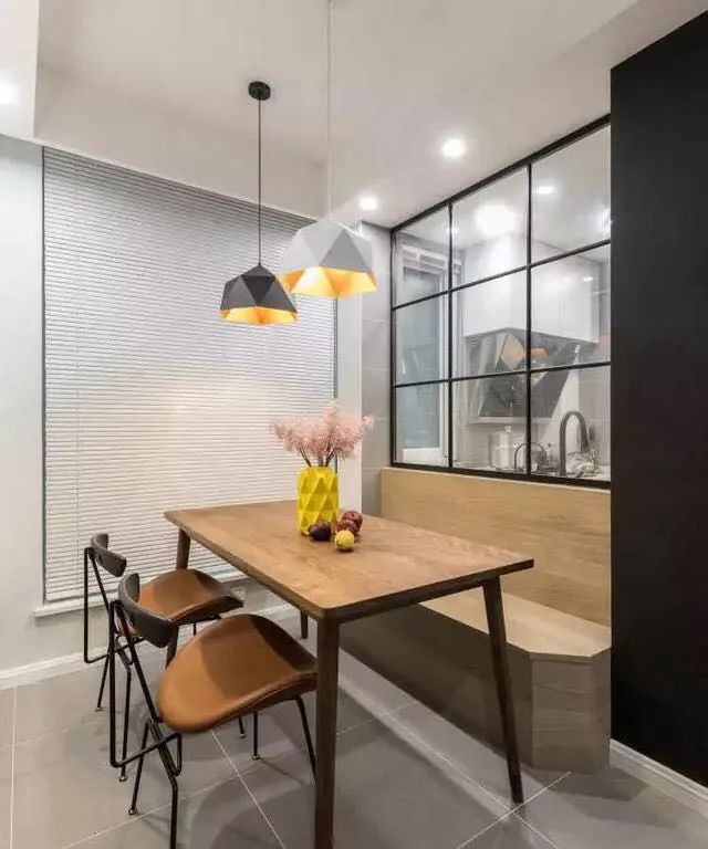 把餐厅挨着厨房,用玻璃隔断划分两个功能区 —— 通透玻璃不遮挡视线,让空间显得更开阔;