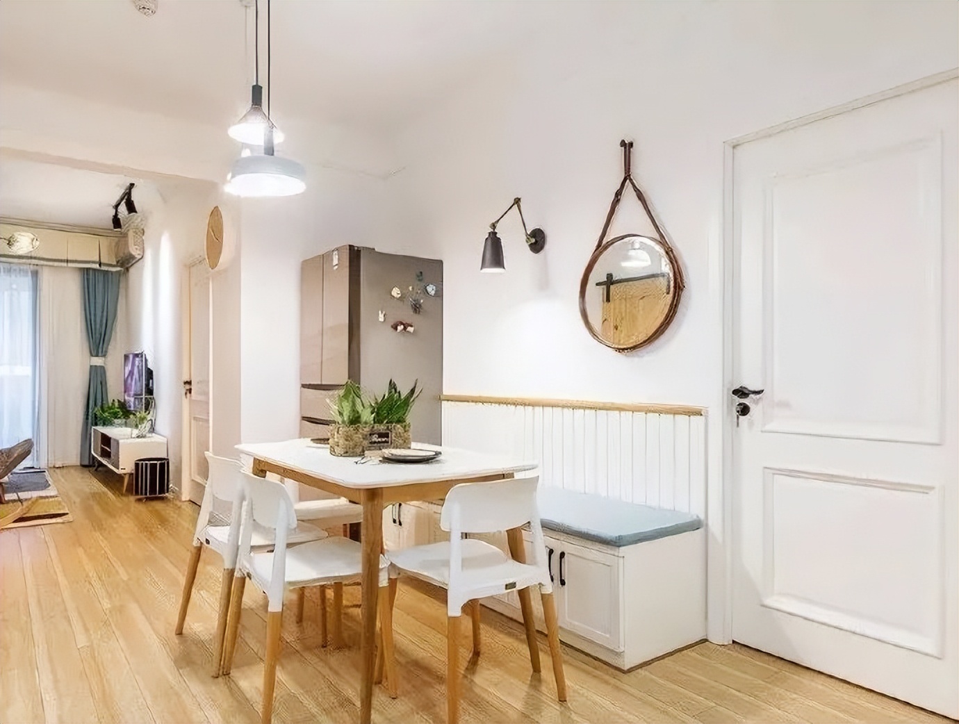 餐桌椅颜色与实木地板相呼应,弱化色彩对比,让整体设计更融合,小空间因色调和谐显得更开阔;