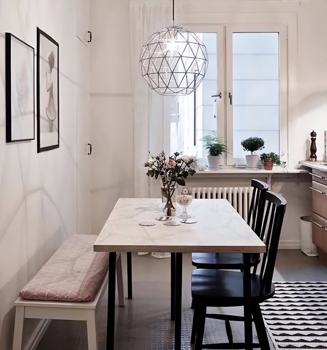 用 “餐椅 + 长凳” 搭配,比两边都放餐椅更省空间,还能打破用餐区的呆板感,赋予空间更多变化;