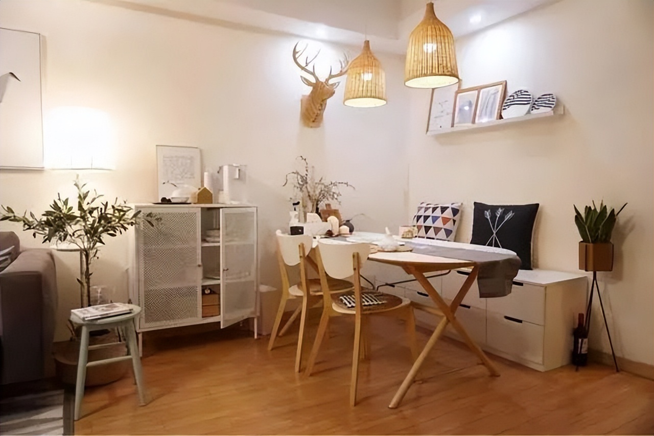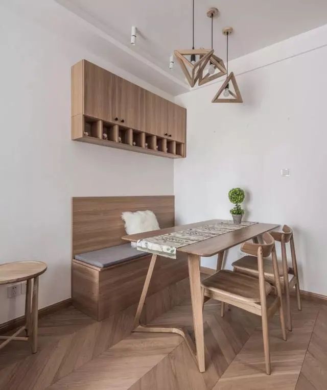 小户型餐厅想显温馨,多用电原木家具 + 辅助灯光准没错,氛围瞬间拉满;