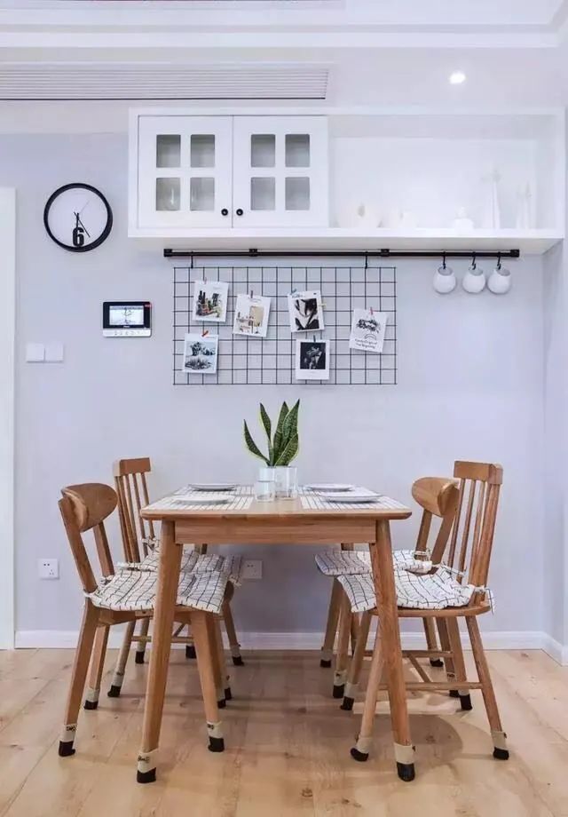 配原木餐桌和细腿脚餐椅,造型轻盈简单,减少小空间的沉闷感;