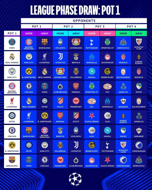 大巴黎:巴黎圣日耳曼作为上赛季欧冠卫冕冠军,本赛季仍是夺冠热门,大巴黎的8个对手无一弱旅,其中7支来自五大联赛,分别是第一档的拜仁、巴萨,第二档的亚特兰大、勒沃库森,第三档的热刺、毕尔巴鄂以及第四档的纽卡,仅有的非五大联赛球队里斯本也是欧洲赛场的劲旅,大巴黎的卫冕之路相当艰难,从小组赛中就每场都是硬仗。
