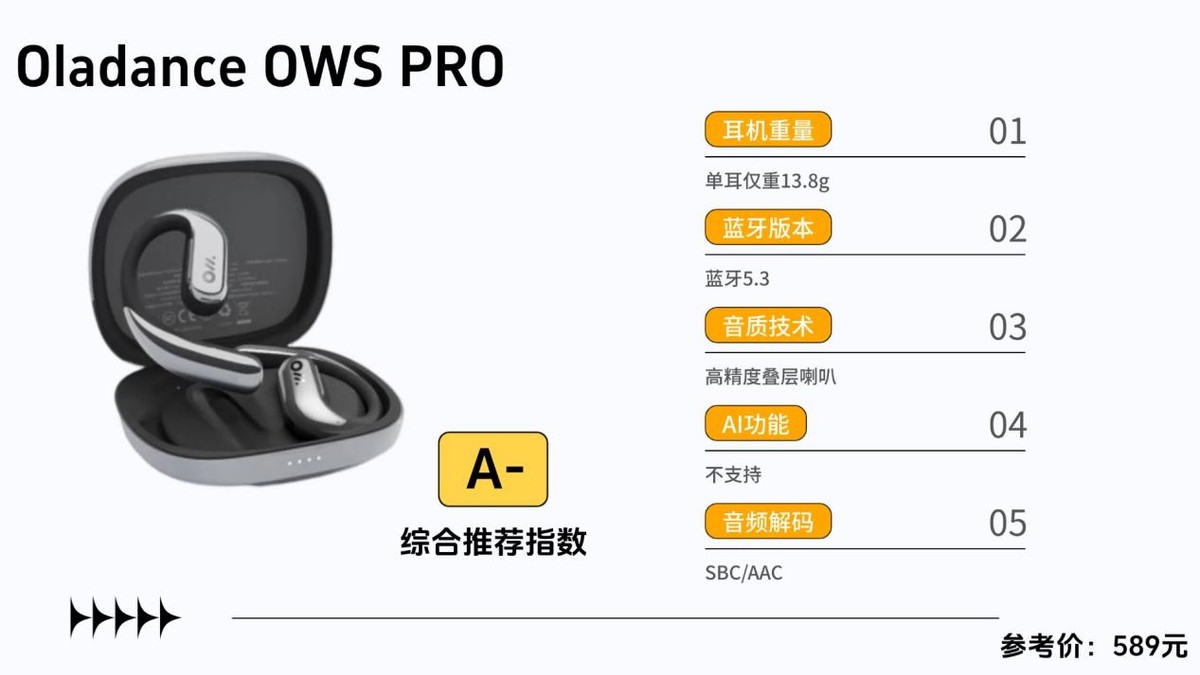 开放式耳机推荐五:Oladance OWS Pro参考价格:589元综合性能评分:86分推荐理由: