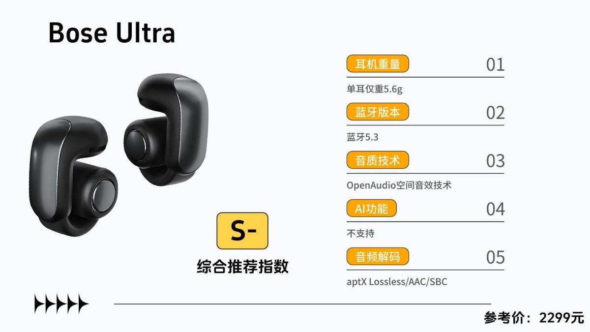 开放式耳机推荐二:Bose Ultra参考价格:2299元综合性能评分:91分推荐理由: