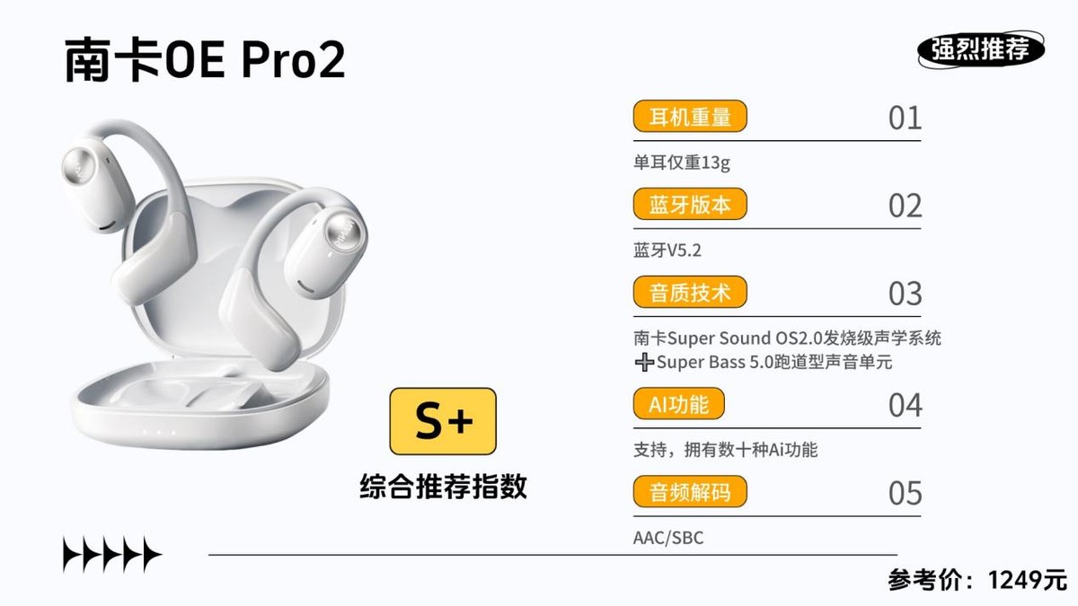 开放式耳机推荐四:南卡OE Pro2参考价格:1249元综合性能评分:93分推荐理由:数码圈中高端口碑销量TOP1,开放式里的“音质巅峰”技术之王