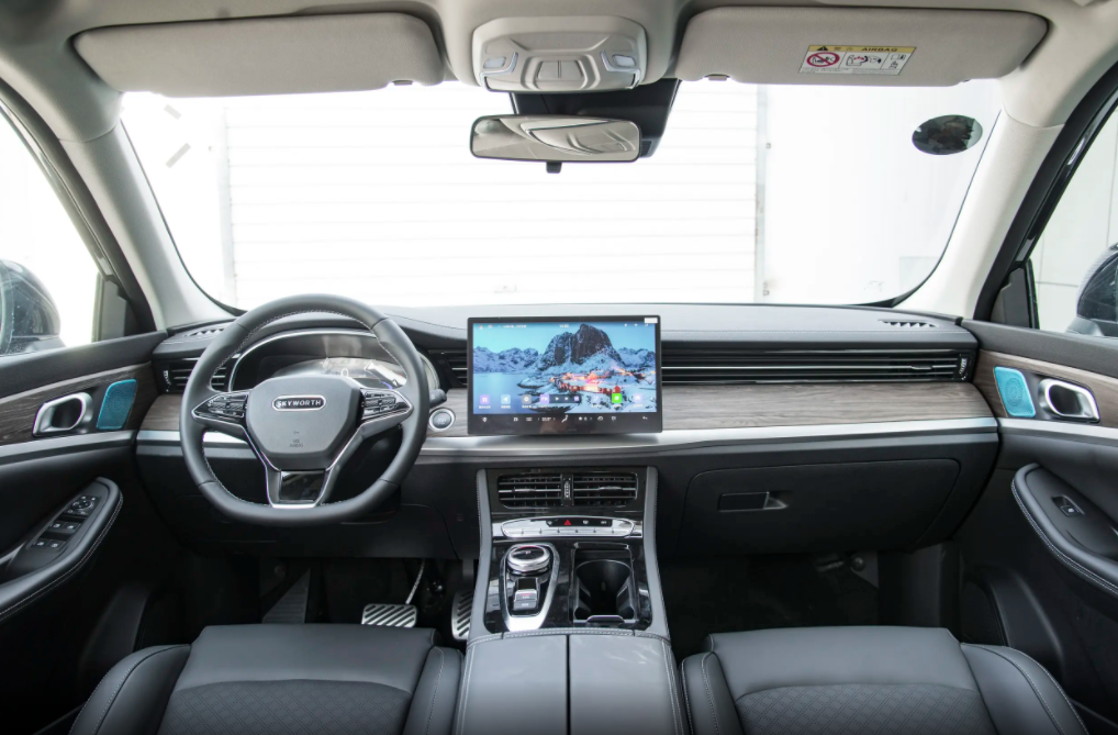 座舱方面,创维HT-i高原版的设计还是偏向于年轻化的,像整个中控台上,除了大量的软包材质之外,在空调出风口方面,它也是采用了贯穿式的设计语言,这无疑让其车内的精致感更加的出众,同时在显示屏幕方面,创维HT-i高原版也是采用了悬浮式的15.6英寸设计,且在屏幕的下边框内则集成了中规中矩的虚拟按键,这样我们在操作起来的时候还是比较方便的。其次在车机内部,创维HT-i高原版的功能配置也比较丰富,像高德地图导航和车联网以及OTA升级和语音识别系统等,该车全都配备,满足我们的日常所需还是没啥问题的。