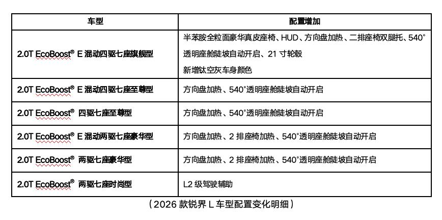 9月26日,2026款福特锐界L升级上市,正式推出7款车型,官方指导价22.98万元-30.98万元。