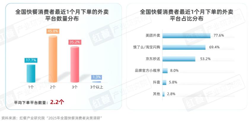 具体到外卖平台,在美团外卖下单的快餐消费者占比最高,占比为77.6%;其次是饿了么/淘宝闪购,占比为69.4%;京东秒送以53.2%的占比居第三位。