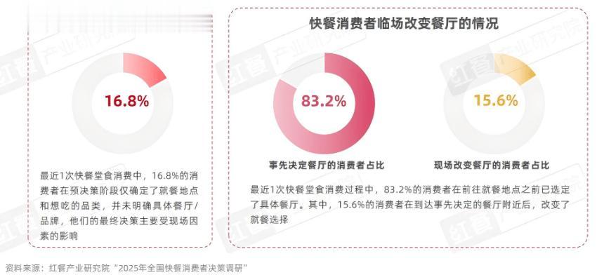 红餐产业研究院“2025年全国快餐消费者决策调研”显示,最近1次快餐堂食消费中,83.2%的消费者在预决策阶段已选定了具体餐厅,其中,15.6%的消费者在到达事先决定的餐厅附近后,改变了就餐选择。