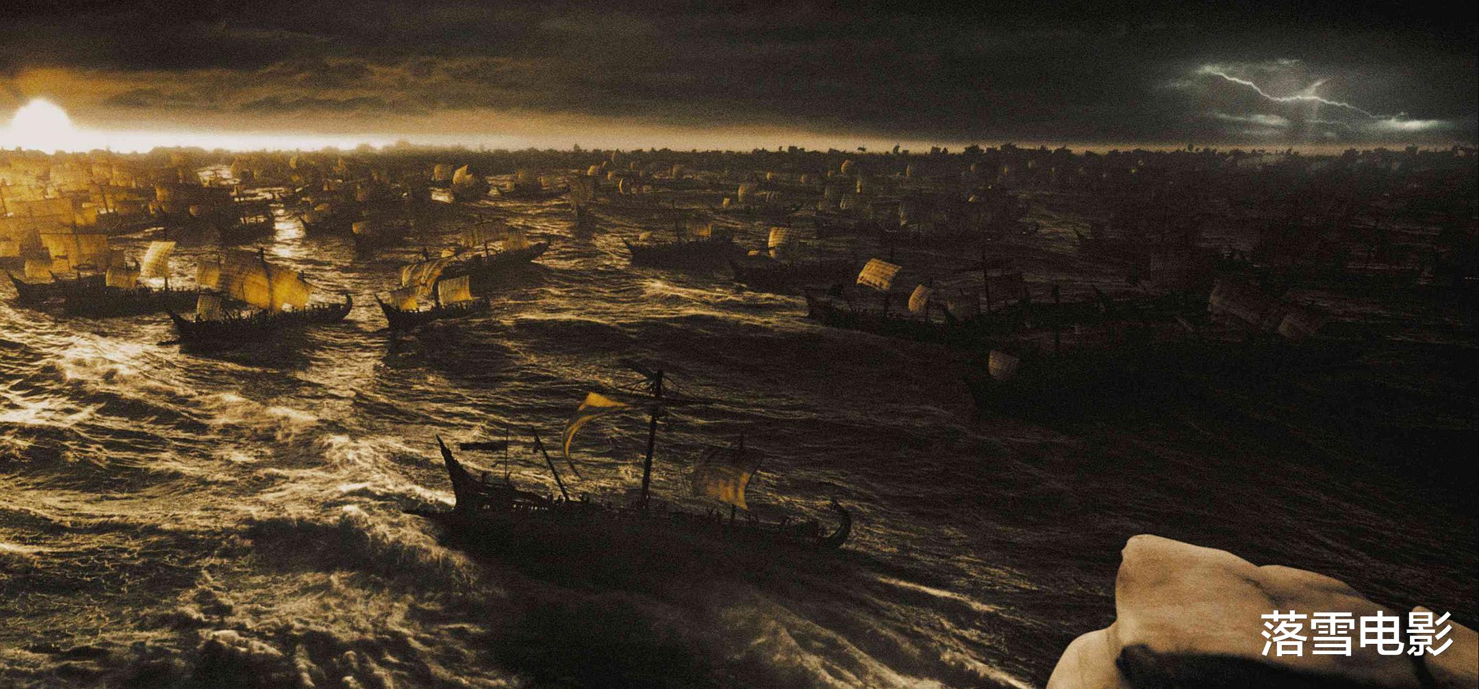 比如300勇士出征是麦田军人,又或者是他们第一看到薛西斯庞大的波斯军队航行在海洋之上时,电影整体画面黑暗、压抑,左边的太阳又极为明亮,也就让一小部分画面色彩过于明亮,一部分过于黑暗,黑暗里偶尔出现的白色雷电,都在某种程度上,增加了画面里非常强烈的压迫感。