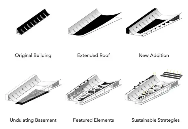 该地块曾服务于港口工业,随着功能转型,原有建筑逐渐脱离城市日常生活。设计以一道流畅的弧形屋顶为标志,在保留建筑原有体量感的同时,植入新元素,使其适应公众参观与当代文化活动的需求。