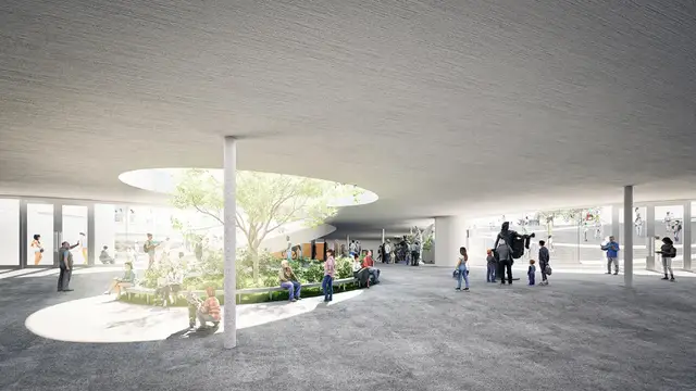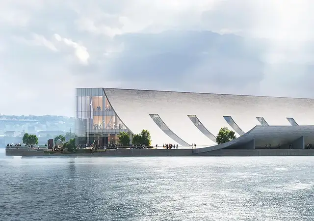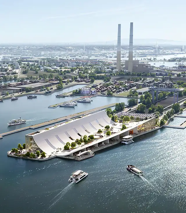 弧形屋顶向水边延伸,形成连续的遮阳篷,界定出介于城市与港口之间的过渡空间。其下方设置半开放区域与有遮蔽的庭院,可从陆地与水面两侧进入,形成全天候开放的公共环境。