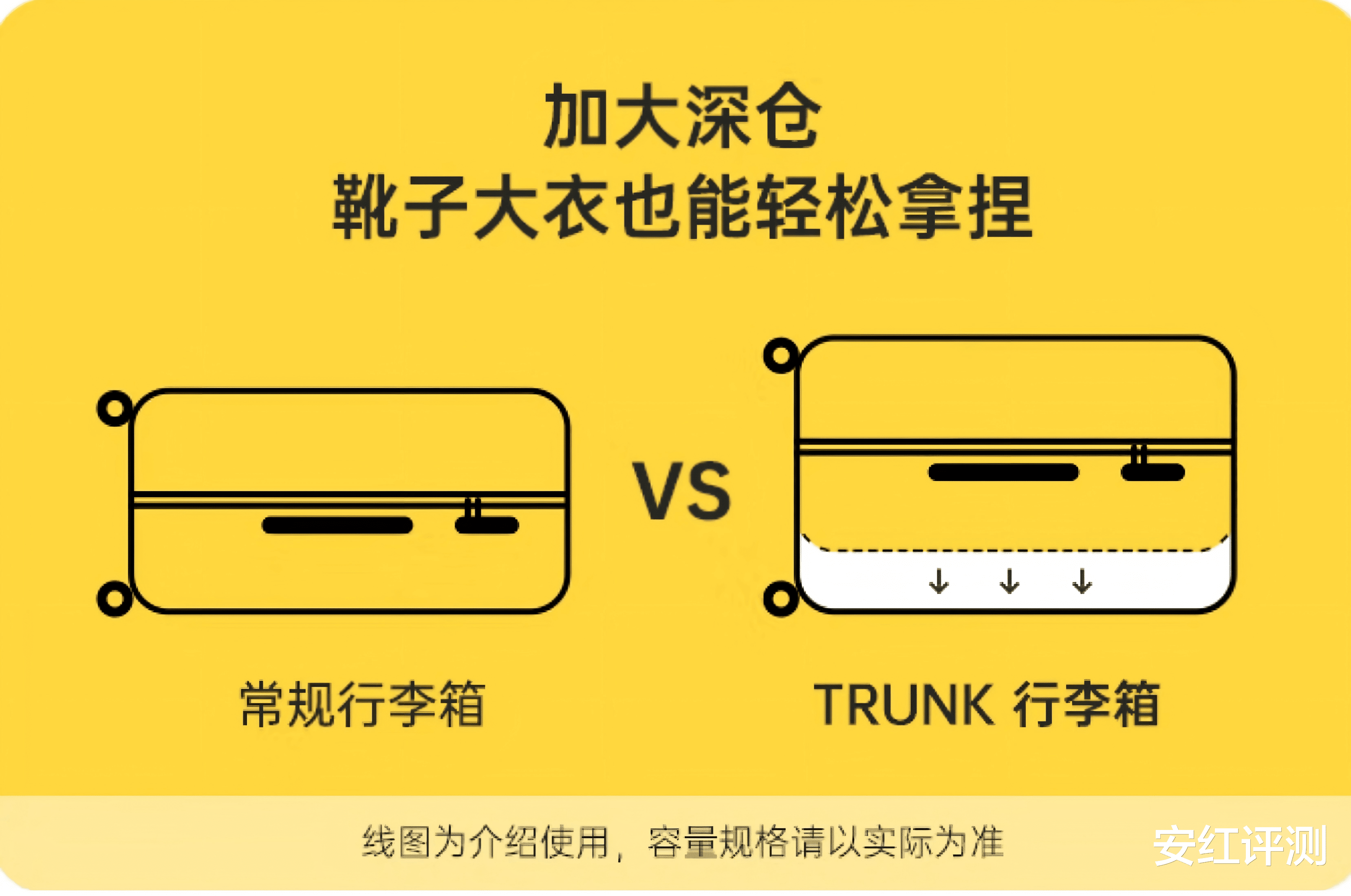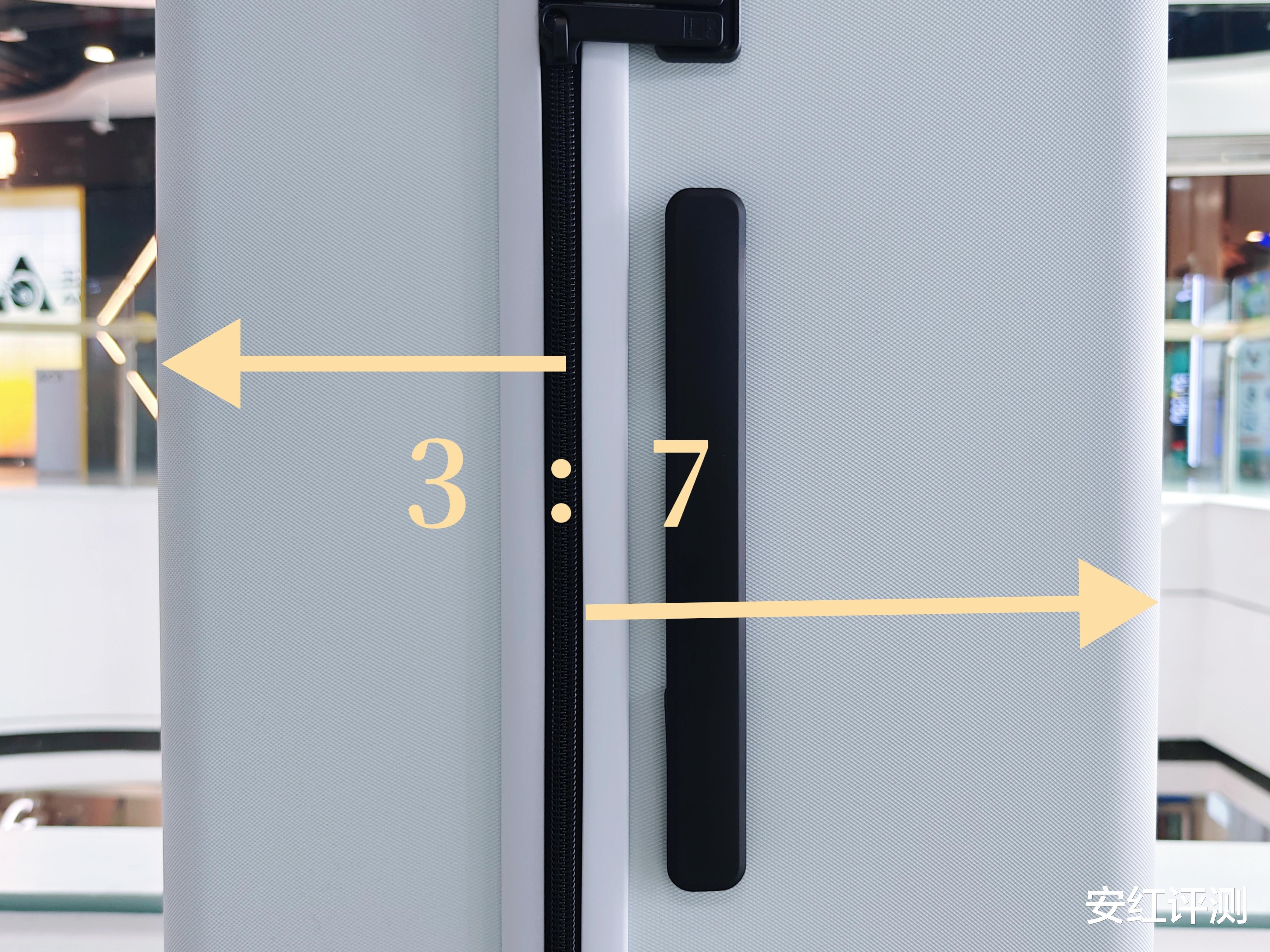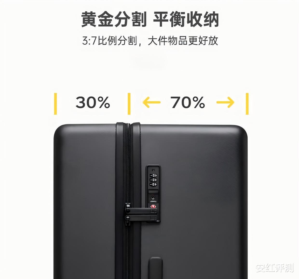 相比常规设计,地平线8号Trunk系列旅行箱的R20小圆角设计改变了原有的存储方式,箱体采用3:7的黄金分割比例,这个占比对需要大收纳空间的人士来说超级友好。横放收纳时,上层空间较浅,收纳的物品少,重量轻,物品取用相对方便;下层空间深,适合放置较大、较重的物品,推拉或站立的时候也不容易侧翻。