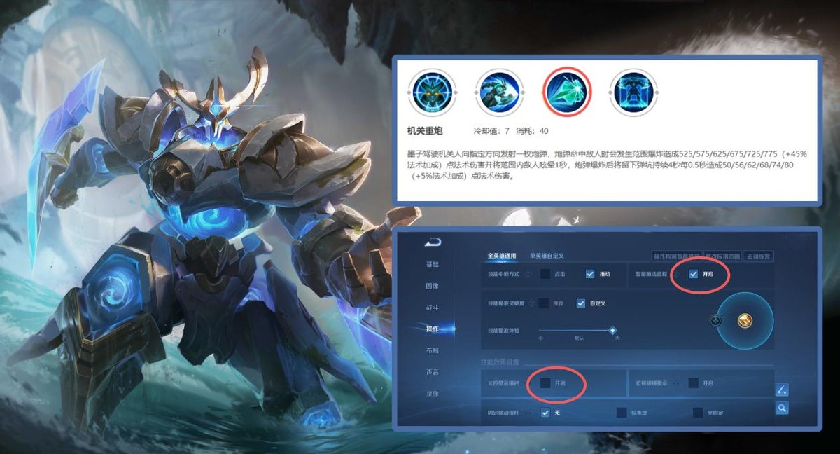 为了提升技能的命中率,还是建议调整一下技能设置:勾选智能施法,长按技能就可以自动锁定最近的地方单位,可以在视野范围外提前进行预判;相应的就要把长按技能描述这里的勾选去掉。