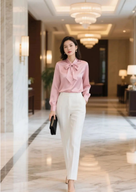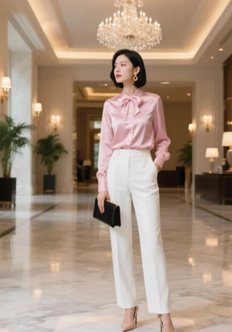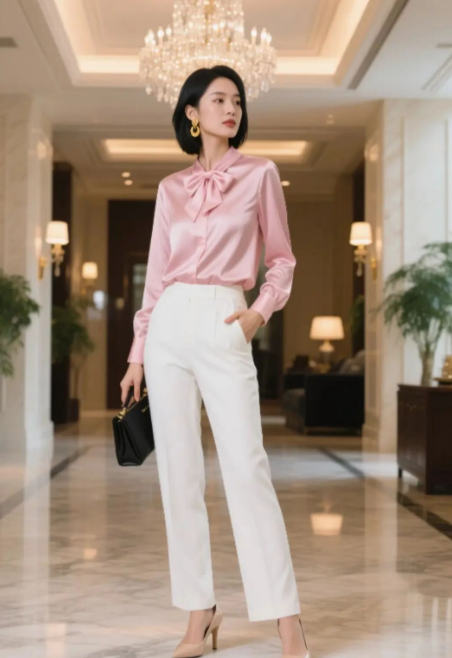粉色蝴蝶结衬衫搭配白色直筒西裤,气质优雅大方轻松打造高级氛围感