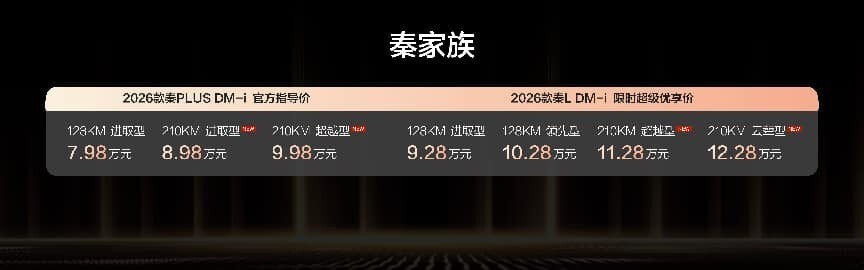 价格太爆炸了,2026款秦PLUS DM-i 210KM长续航版卖8.98万起,2026款秦L DM-i 210KM长续航版卖11.28万起。上市权益也保留了,有4000元的超级购置税补贴,有高级车色免费送,还有TBC高速爆胎稳行系统免费送等等。
