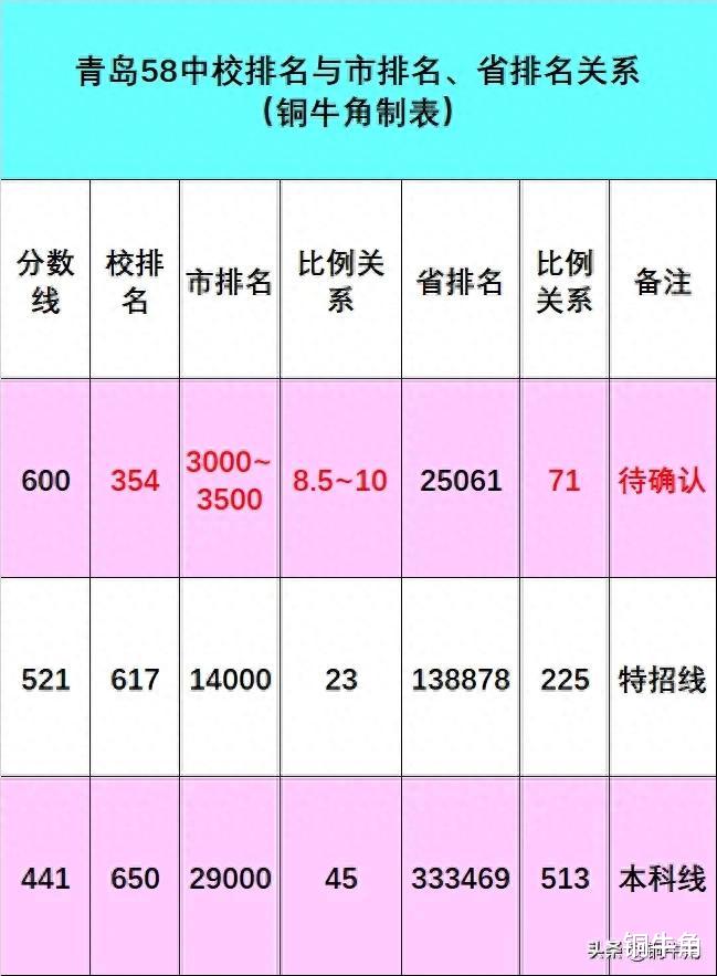 青岛市2025年600分以上人数,网传数据有4800人,但铜牛角认为这个数字可能有问题,真实的人数可能为3000~3500人左右,所以600分左右的时候,校排名与市排名的比例大约为8.5~10。
