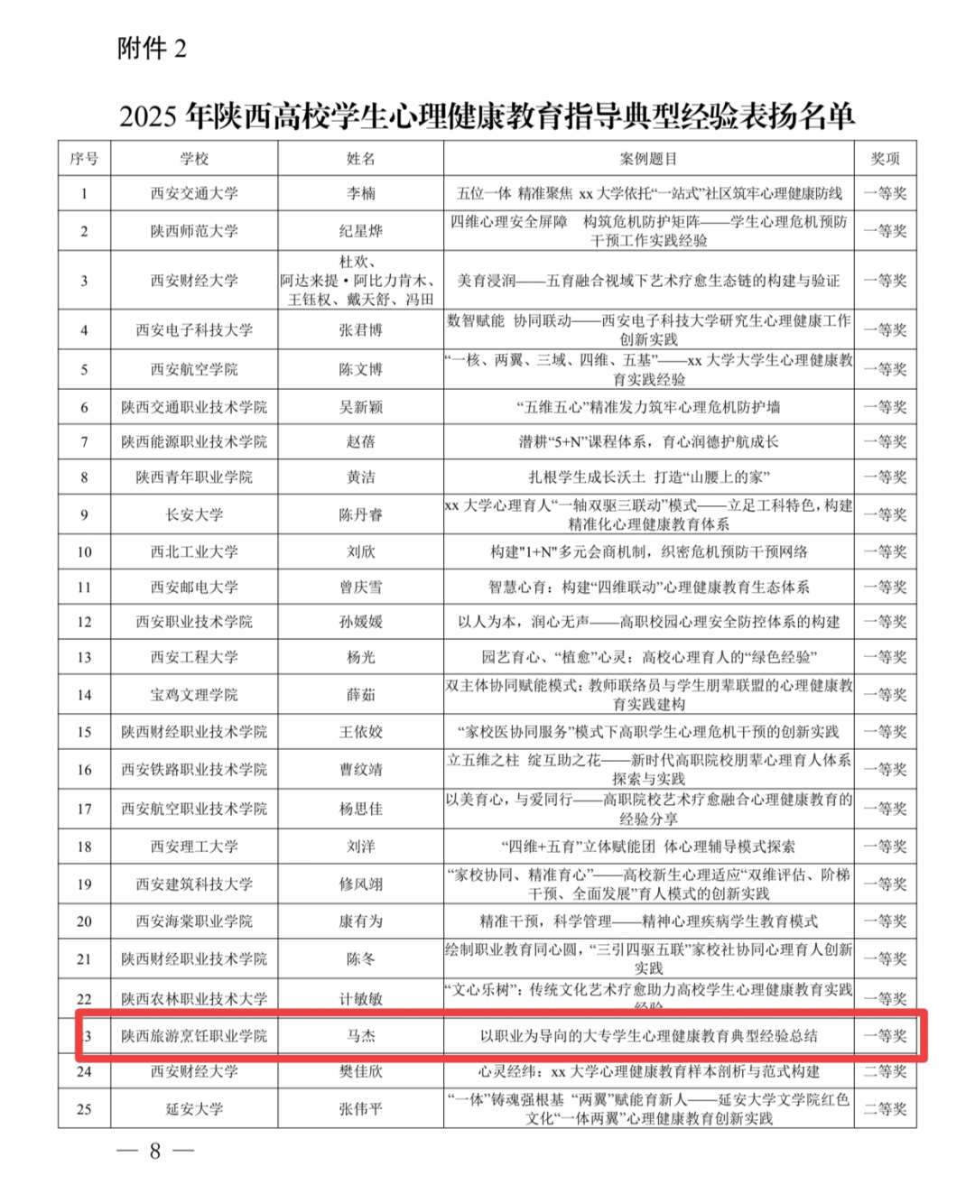 由马杰教师团队撰写的《以职业为导向的大专学生心理健康教育典型经验总结》荣获2025年陕西高校学生心理健康教育指导典型案例一等奖。