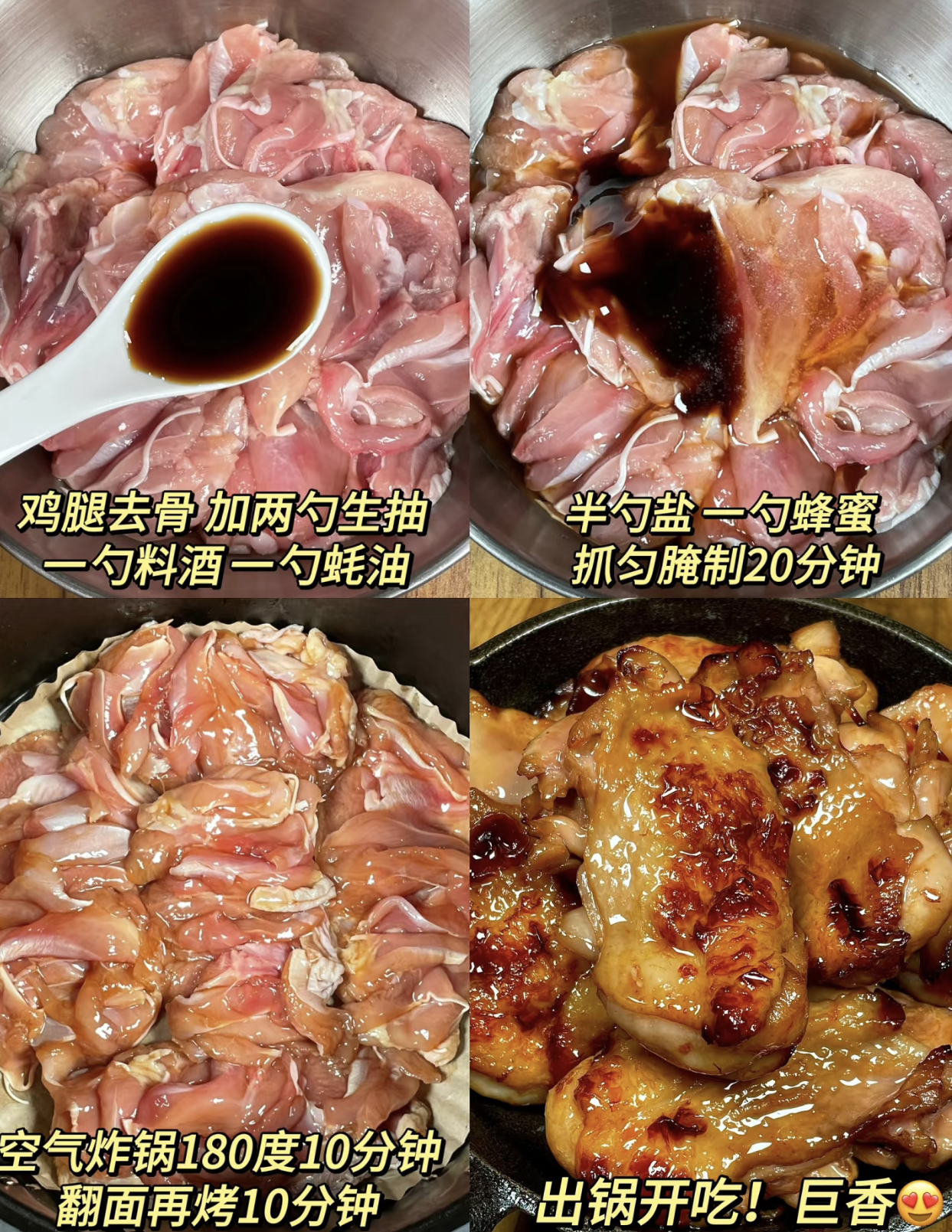 腌制完成后,我们就可以开始烹饪了。这里我们使用空气炸锅来烹饪鸡腿,因为它能让鸡腿在不加油的情况下也能烤得金黄酥脆。将腌制好的鸡腿肉平铺在空气炸锅中,设置温度为180度,先烤10分钟。这个过程中,鸡腿肉会逐渐收紧,表面开始形成一层美味的焦糖色。